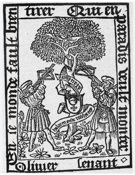 The shield hanging from the tree bears the world-orb turned upside down, the banderole around the trunk reads, helas monde retorne toy [Alas, world, turn yourself back!] The frame couplet reads, En ce monde fault bien tirer/ Qui en paradis veult monter [In this world, he who wishes to mount to paradise must shoot well — I suspect sexual innuendo, and indeed, that the cut may originally have illustrated a lost Monde pamphlet]