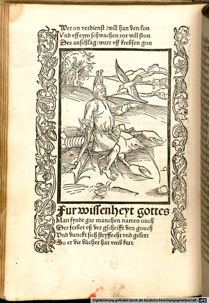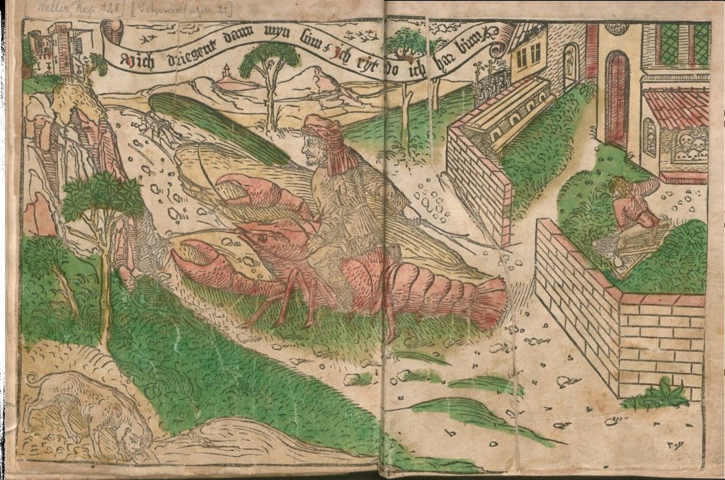 A less familiar inhabitant of the monde renversé is the lobster or – to use the contemporary term, as the species were not normally distinguished in pre-Linnaean times – ‘crab’. In the early modern world the salient characteristic of this creature was that it often moved backwards (or sideways), and the classic image, the woodcut illustrating chapter 57 of Brant’s Narrenschiff [Ship of Fools], which depicts a fool in the characteristic ass-eared cap and bells riding on a lobster.