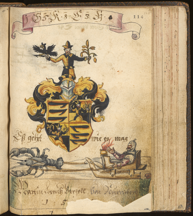 On f.114r. of the Francklin album (below) beneath a coat-of-arms dated 1583, however, a single lobster draws a man in a sleigh, the image being labelled es gehet wie es mag [it goes where it wants]– it is clear that the artist expected us to know the rest of the saying –als wenn Krebs am Schlitten ziehen [like when ‘crabs’ draw a sleigh] as Lehmann’s Florilegium politicum (Lübeck, 1639), the earliest literary record of the full form, presents it — the Francklin painting thus representing a considerable antedating of the proverb.