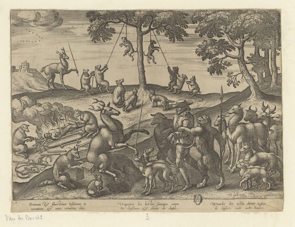 This print below, engraved by Pieter van der Borcht (d.1608), while obviously not the source of the above album images, is the earliest example known to me of the popular ‘Animals’ Revenge’ motif, showing the huntsman brought to trial (and torture), his hounds being hanged in the background.