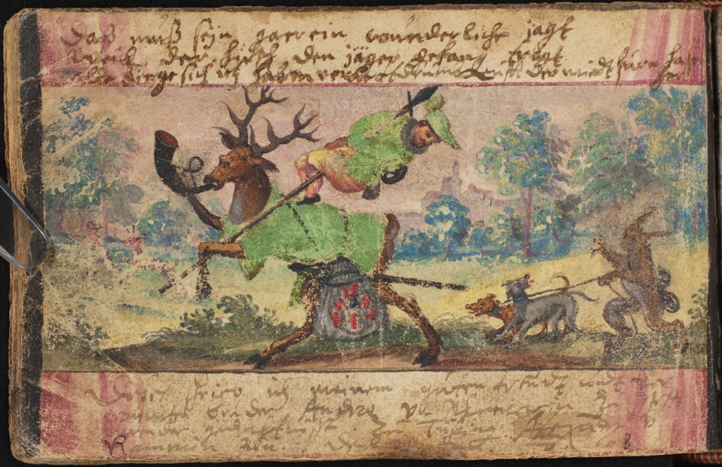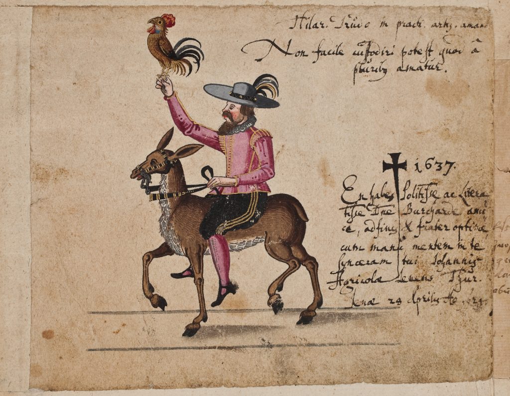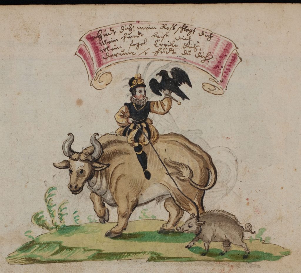 And if I’m to put them anywhere, this is surely the place for other unconventional mounts! Here, from the album of Christoph Huber, we see a gentleman out hawking (?crowing) on bullback, with a pig on a lead. The inscription reads