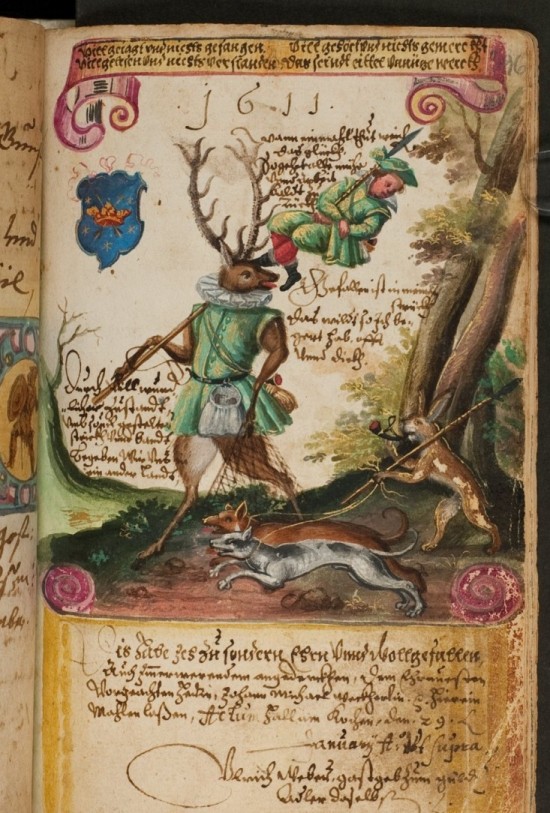 Another classic denizen of the world turned upside down is the stag who returns from the hunt – walking upright on his hind legs, of course — with the huntsman dangling from a pole over his ‘shoulder’.