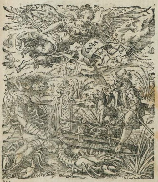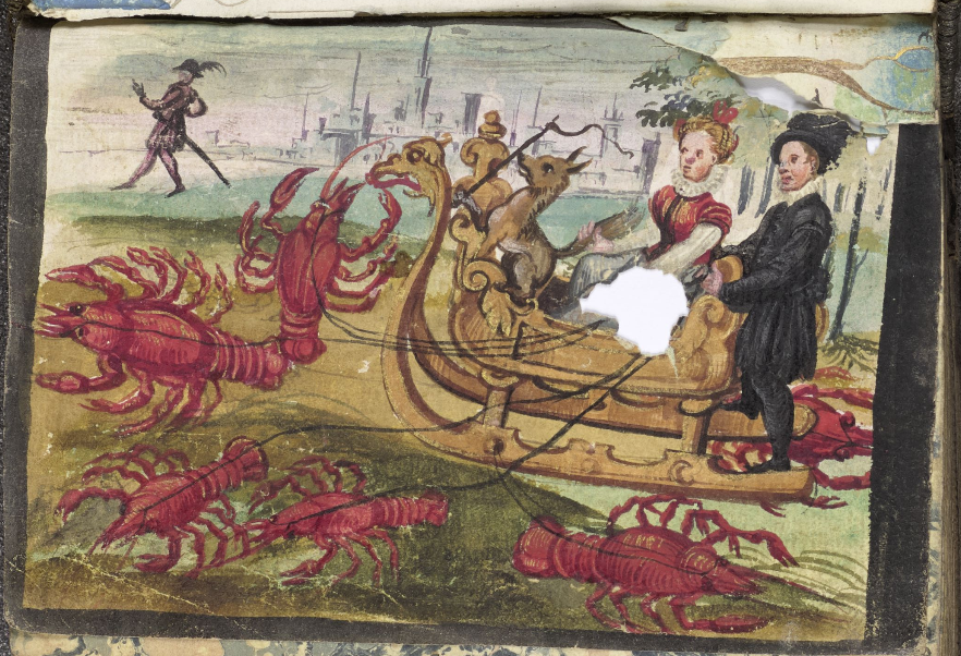 The von Abschatz album (above) features a couple and their dog in a sleigh drawn by six lobsters, only two of which are heading forwards, the others head backwards and sideways. Here the source for the motif is probably a woodcut entitled Fama by Jost Amman c.1579.