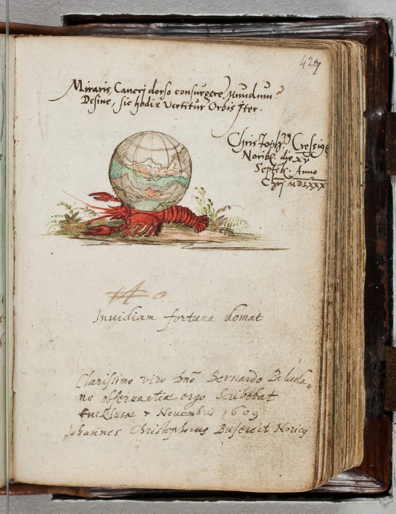 The emblematic image of the world-orb on the back of the backward-walking lobster is found first in the albums before being taken up by the emblem-books. It appears as early as 1560 in the album of Abel Prasch the Elder, and 20 years later in that of Bernardus Paludanus [Berent ten Broeke] (BELOW) — and later in the Kaltenhausen zu Greiffenstein (1615), Gesner (1644) and Dietherr von Anwanden (1651) albums.