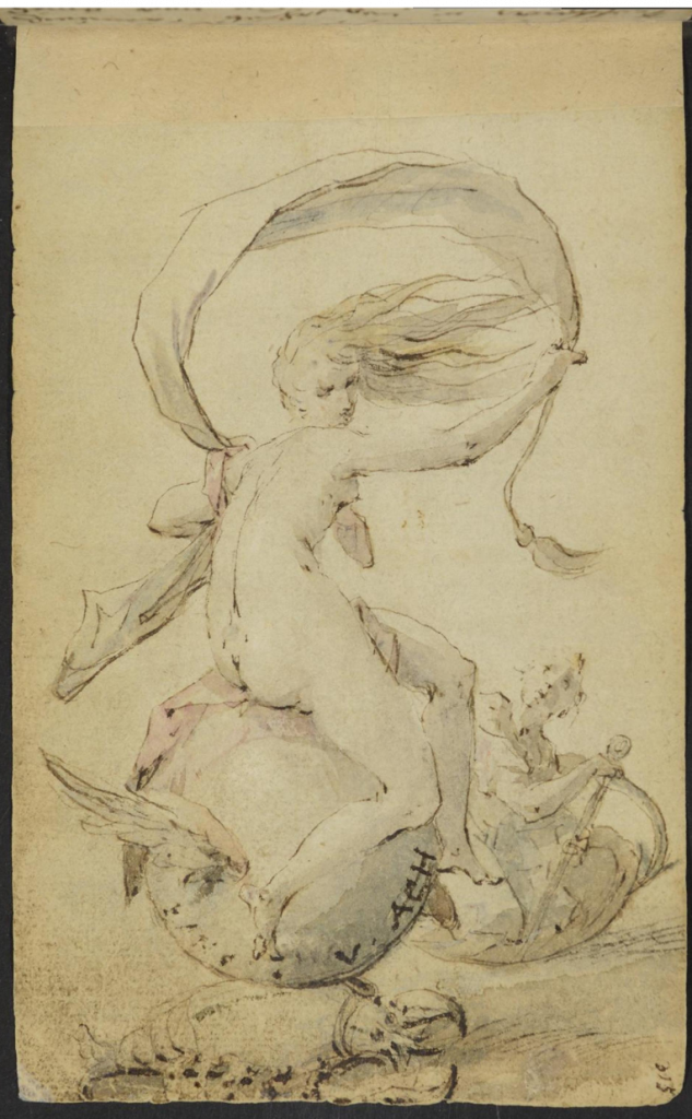 We are used to seeing Fortuna standing on a globe, but an unnoticed drawing in the Berlepsch album (1608-15), signed by painter Hans von Aachen, depicts the goddess sitting on a winged globe borne on the back of a lobster.