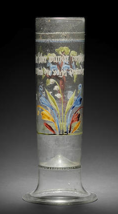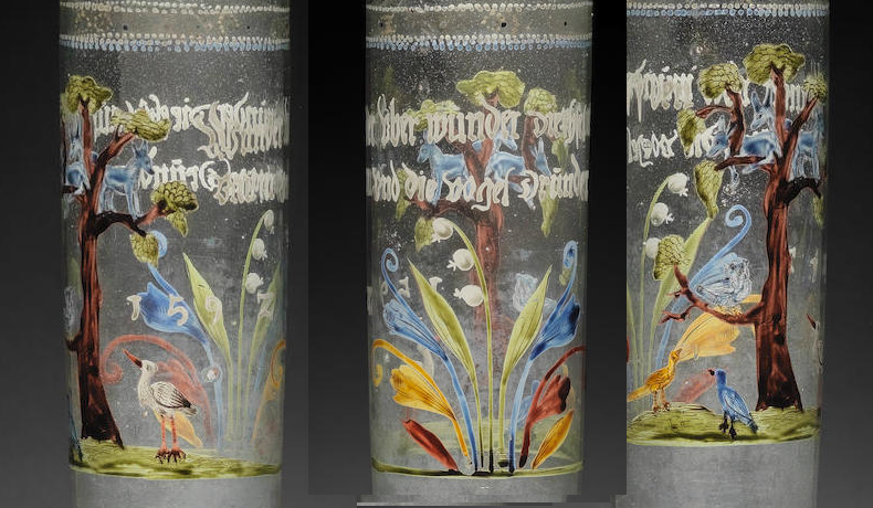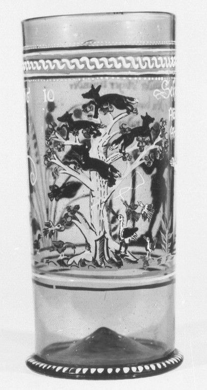 From the end of the century survives a magnificent Stangenglas dated 1592 and enamel-painted with the figural motif and caption: Wunder uber Wunder / die Ehsel auff den Baum und die vogel drunder. [iv]