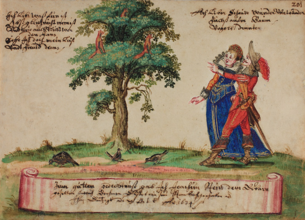 The Harant album now in Prague (dated entries 1631-60) presents an apparently more sedate couple beneath the foxes in the tree, but in alarming company.