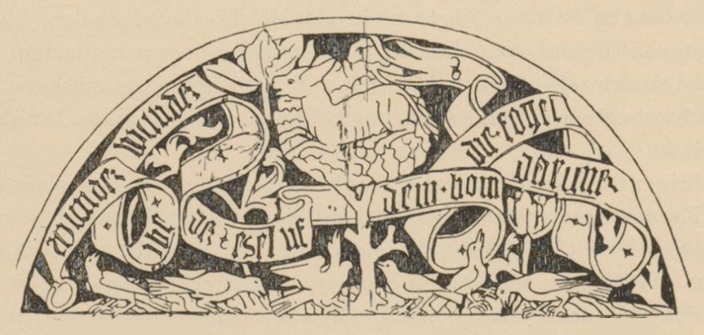 The earliest instance I am aware of, dated 1521, is a carving in the low-relief Flachschnitzerei technique, formerly located above the door of the guestroom of the Oetenbach nunnery, near Zurich, but now reconstructed in that city’s museum, and labelled wunder ibe[r] wunder der esel uf dem bom die fogel darun[d]er.