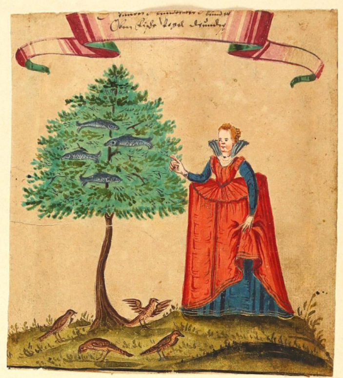 Sehett hyr wunder vbyer wunder Fösche [sic] auff Den baume vndt Fögel dar vnder. [v]