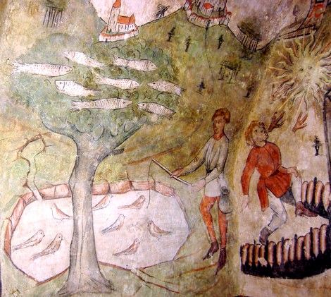 If anything, this is the traditional variant — fish in the tree! Wonderful accident of survival! An orphaned early 17C leaf sold at auction by Pieter Kiefer on 5th December 2022, as lot 2728. Cropped above, unfortunately, but I assume the first line ends Wunder, then follows the usual 2nd line of the couplet: Oben Fisch Vogel drunder [fish above, birds below] — someone better acquainted with this cursed cursive than me can doubtless supply the rest of the first line — pleeease, Gentle Reader! The perfect parallel and precedent, indeed, has to be the image below, excerpted from the wonderful wall-painting of Schlaraffenland/Cocagne at Ostermiething in Austria, c.1470