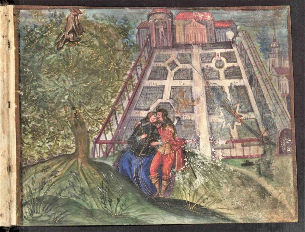 The Harant album now in Prague (dated entries 1631-60) presents an apparently more sedate couple beneath the foxes in the tree, but in alarming company.[vi]
