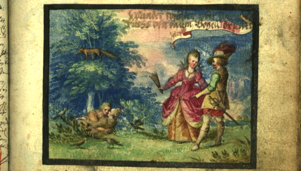 The 17C fox variant of our motif introduces a new, erotic element absent from the 16C ass original, in which — at most — the loving couple stand either side of the tree. The iconographically rich early 17C Heidenreich album is particularly relevant here. Its example, dated 1606, takes the form of a lift-the-flap painting: with the flap down, the fox stands on top of the tree, the birds walk about the foot of it — with the flap up, we see a young couple lying under the tree, the man’s hand cupping the woman’s bared breast.