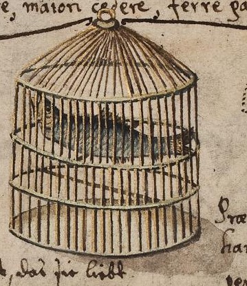 SADLY, I have not seen any reproduction of the scene of fish sitting at table while dogs pursue men in the water painted in the Albert von Rorbach album (1617-33) according to the RAA. But another surreal little drawing on a crowded page in the Grossmann album certainly qualifies for inclusion here, I think — a fish in a bird-cage!