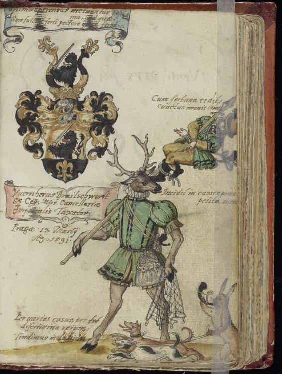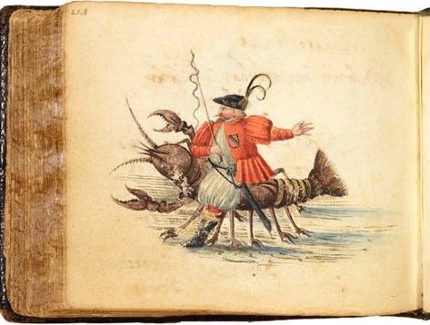 Current in 16C Germany too, it was inevitable that the motif would enter the imagery of the alba amicorum. Undated, but some time before 1613, painted on f.17r. of Daniel von Redern’s album we see a man about to saddle up a lobster against a maze-like background, the everyday nature of the action somehow making the motif more explicit and more absurd [Stockholm, Kungl. Bib., MS Ir 2a]. A little later in the 17C, in the Giese album recently acquired by the Deutsches Nationalbibliothek, we see the man now mounted confidently astride his crustacean, holding the whip in his left hand, and wearing a badge which perhaps identifies him as a Postbote [courier] – piling on the irony!