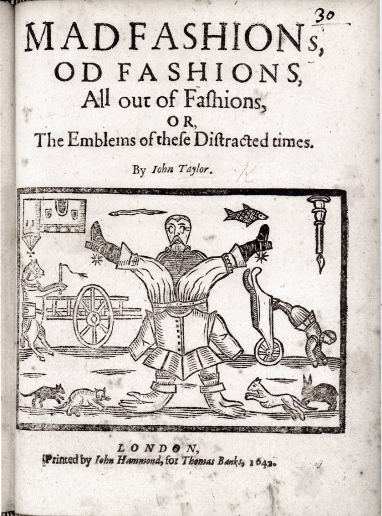 More or less contemporary is the title-page woodcut to John Taylor’s significantly titled Mad Fashions, Od fashions, All out of Fashions (1642), which makes full use of monde renversé motifs to function as The Emblems of these Distracted Times