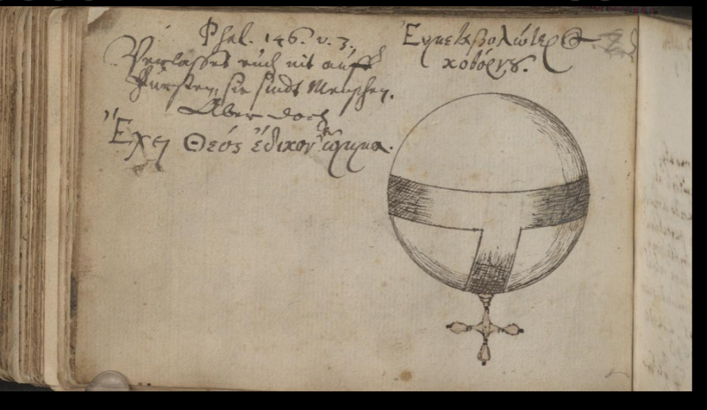 By the date of this tiny sketch of an inverted world orb labelled, Also ist itz der welt hinnab [Now the world is upside down like this] drawn on f.163r. of the Erich album in 1627, we may assume that the symbol was well-known. Twenty years later the motif occupies a full page in the Speidel album (1642-53)