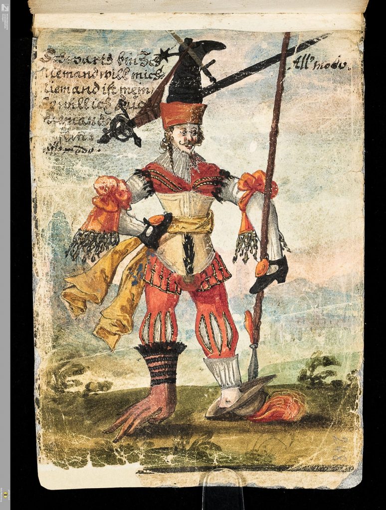 The Allamodo satire on fashion was at its height in 1629, and this painting is presumably part of that satirical fashion, but we note that he wears on his head what should be on his foot (boot), on his hands what should be on his feet (shoes), and on his feet what should be on his head and hand (hat and glove).