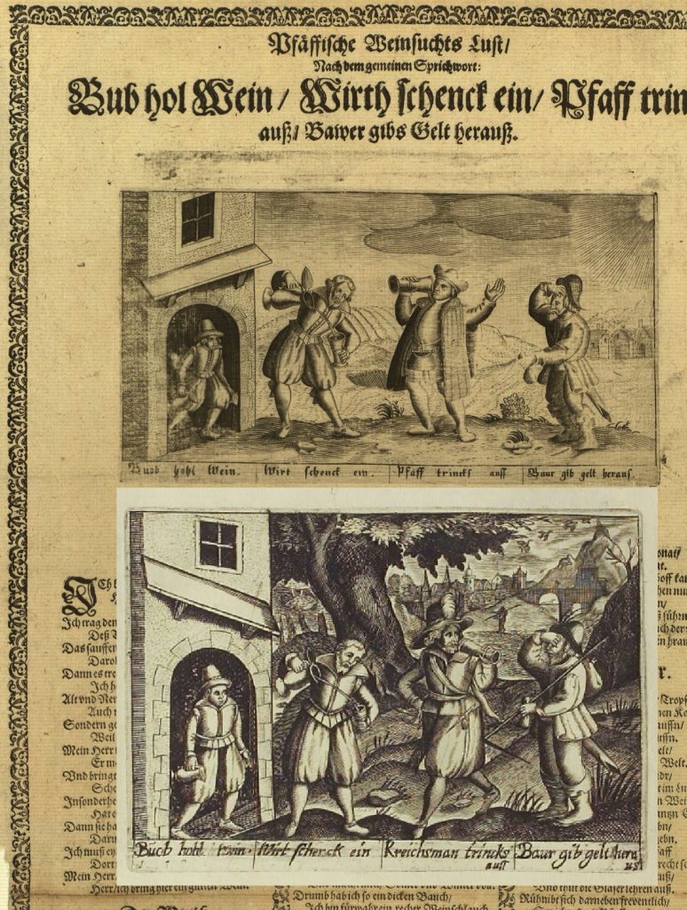 In 1620, long after the earliest album versions of the motif were painted, a single-sheet print was published in Speyer illustrated with an engraving of our motif. Entitled Pfaffische Weinsuchts Lust [the priestly lust after wine] and quotes the 4 speeches which it styles a ‘common proverb’ — though it is noticeable that none of the 7 album images includes a priest as the exploiter, and in an evidently closely related engraved plate which appeared in the 1637 edition of the Pugillus facetiarum [see comparison below] the exploiter is a soldier.