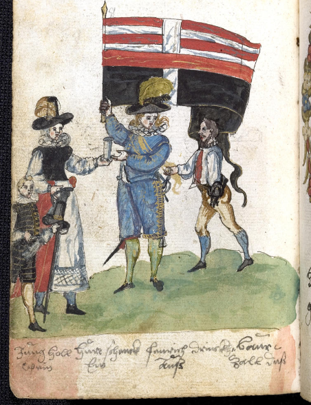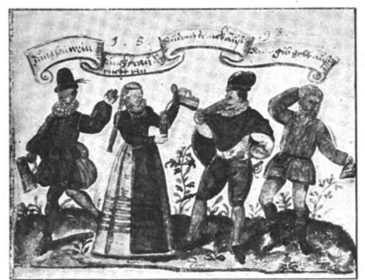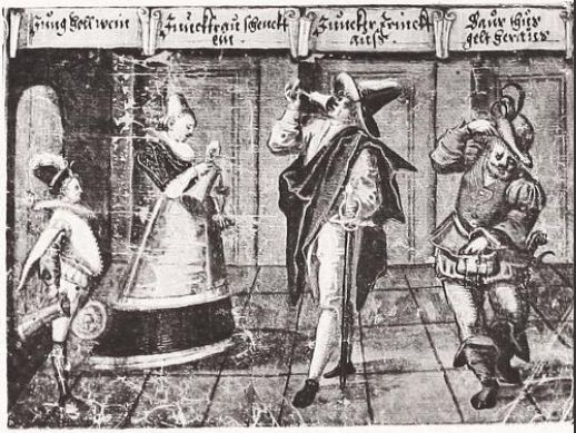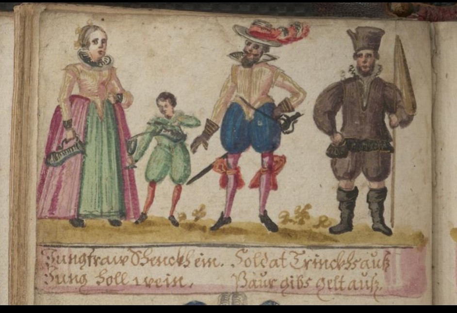 This satirical motif involves 4 standing characters in a row — from left to right, first the boy [Bube] who brings the wine, then the young woman who pours it (in the later prints, she is replaced by the landlord), then the man who drinks it off, and finally the peasant/poor man [Bauer] who pays for it. It seems to appear in the alba amicorum before it exists as a print [see dates below] The exploiter varies: Soldier/Priest/Student/Whore.