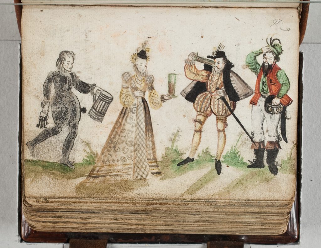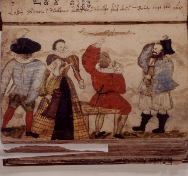 Another example, but I have no reproduction, in the album of Johann Heinrich Kirchberger (dated entries 1602-7). Labels: Jung hol d. Wein; Jungfraw Schenck Ein; Student Trinckh auss; Baur gibs Geld raus — in the Stadtbibliothek, Nurnberg — according to RAA