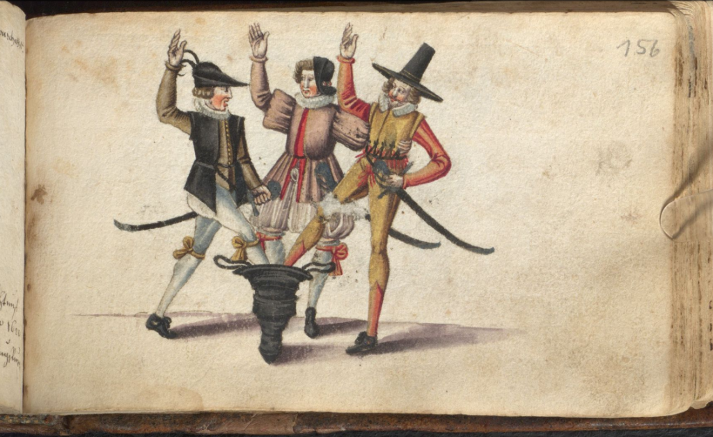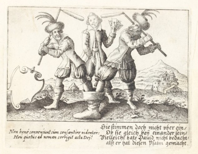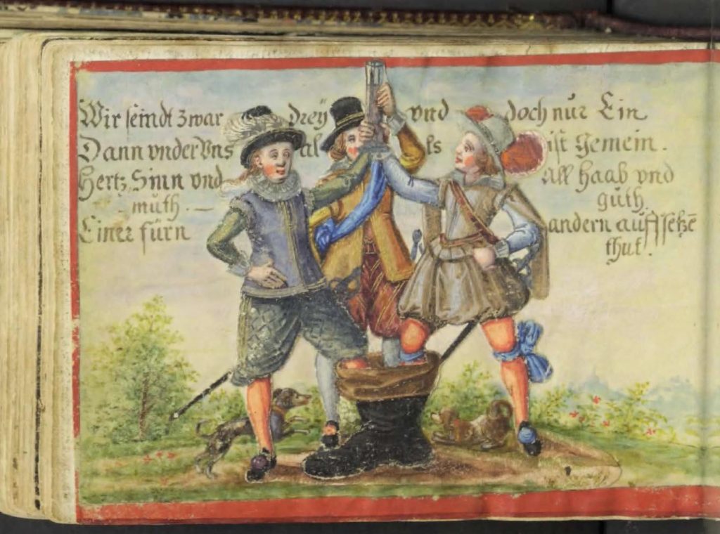 This motif is a bit of a mystery to me! — I wondered if it is some historical reference to the uprisings of 1525? The Deublinger album inscription seems to suggest it’s a Three Musketeers “All for one, and one for all” sentiment.