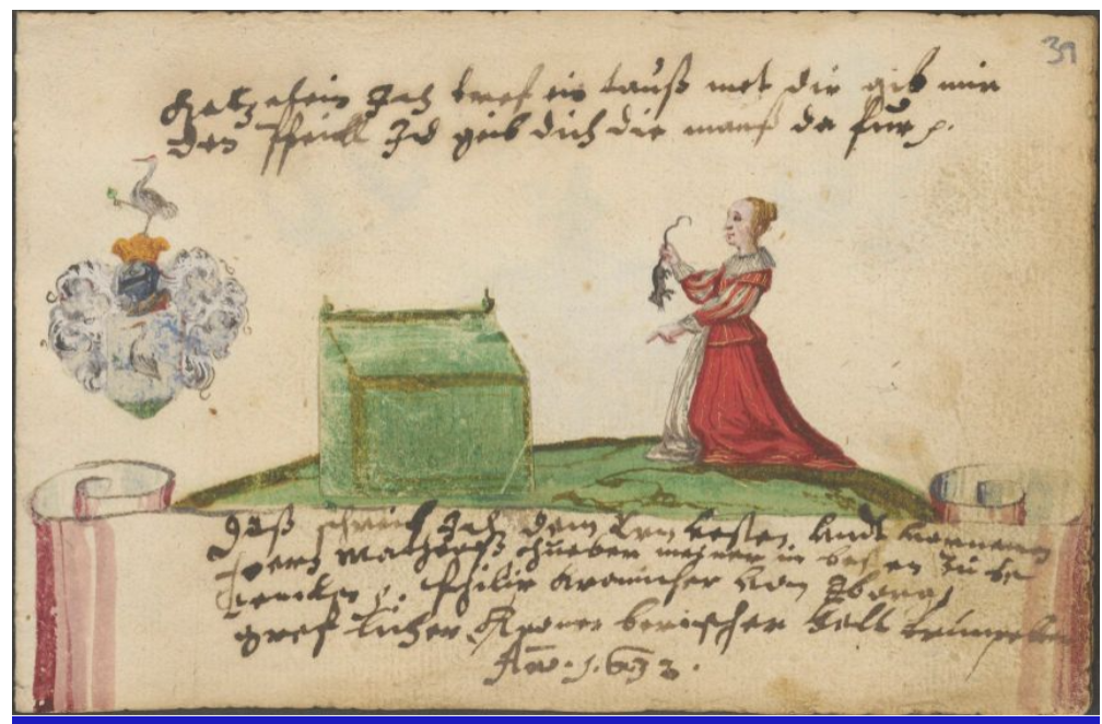 This is a lift-the-flap miniature in the album of Matthias Huber, this page dated 1633. Here the flap is closed. Weimar, Herzogin Anna Amalia Bibliothek, Signatur Stb 44 Nachtrag, f.39r.