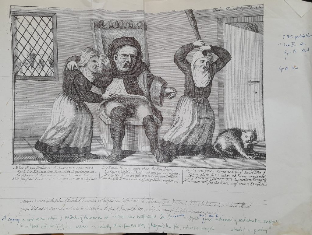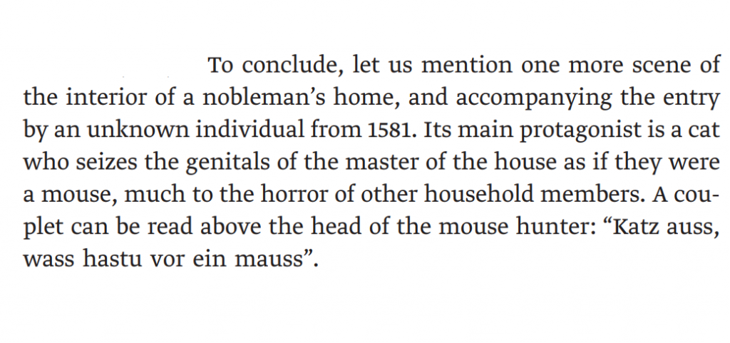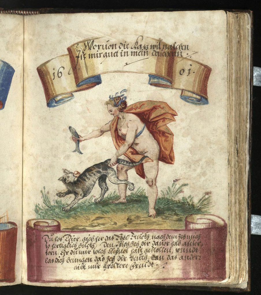 A surprisingly widespread motif from the late 13C manuscript drolerie via the 16C prints to the late 16 and early 17C alba amicorum, in which I am currently aware of 3 examples dating from 1581-1633 (2 of which are reproduced below). The woman whose dildo has been stolen, tries to persuade the cat to drop it, by offering it a fish instead — as in the Heidenreich album and the earlier German print — or a mouse, as in the Huber album’s lift-the-flap presentation.