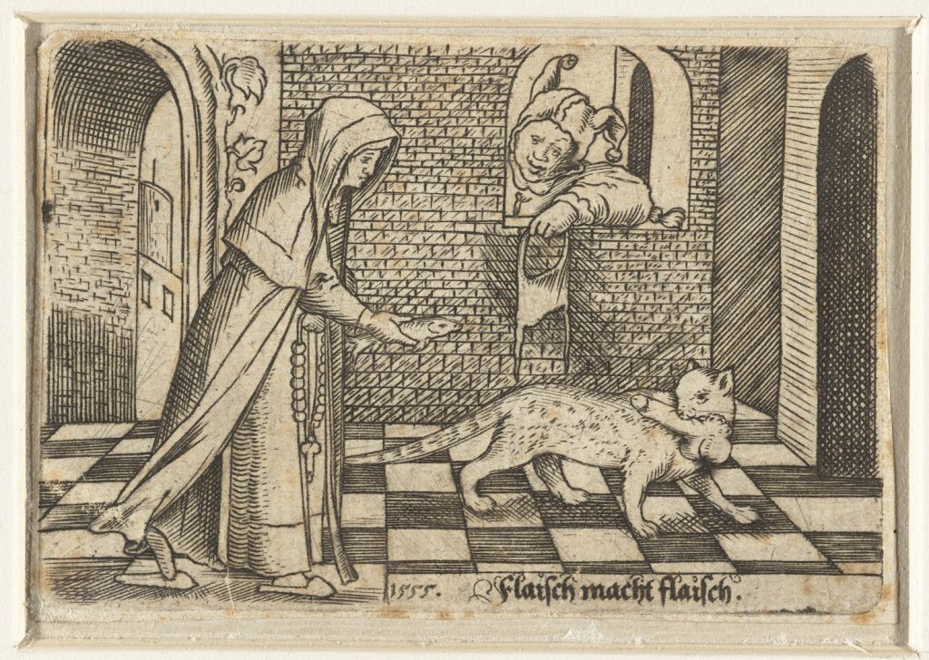 German print dated 1555. Amsterdam, Rijksmuseum, RP-P-OB-78. 861. Here the comedy is exacerbated by the fact that the woman is a nun — with a surprisingly phallus-shaped bead hanging from her rosary — and by the fact that the costumed fool who observes the scene dangles his breech-cloth through the window. Flaisch macht flaisch means, literally, ‘Flesh makes flesh’.