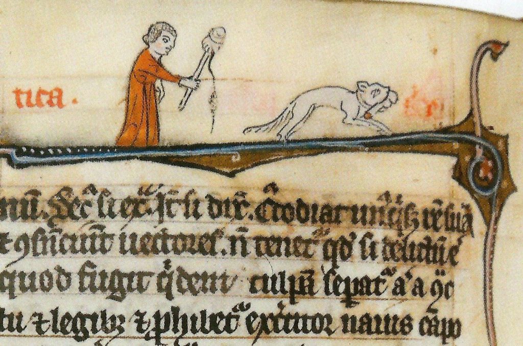 woman chases cat with distaff, marginal drolerie in the late 13C manuscript, Bruges, Stadsbibliotheek, hs. 251, f.299v.