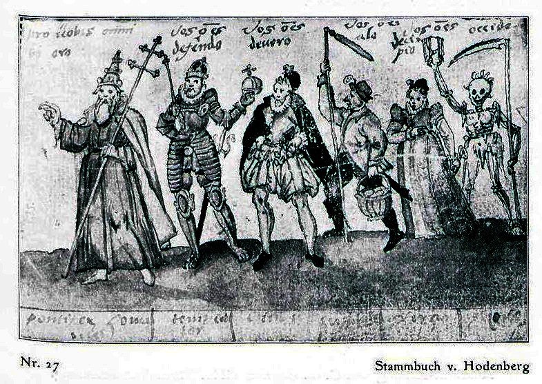 Seventeenth-century German authors state that this Latin version was previously to be seen painted in monasteries, and according to Mitteilungen der schlesischen Gesellschaft für Volkskunde 27-29 (1926), 194, a 17C wall-painting of the subject formerly adorned the church-tower at Szestno in the north of present-day Poland, featuring the Three Estates and Death, who were allotted the following speeches in Latin: