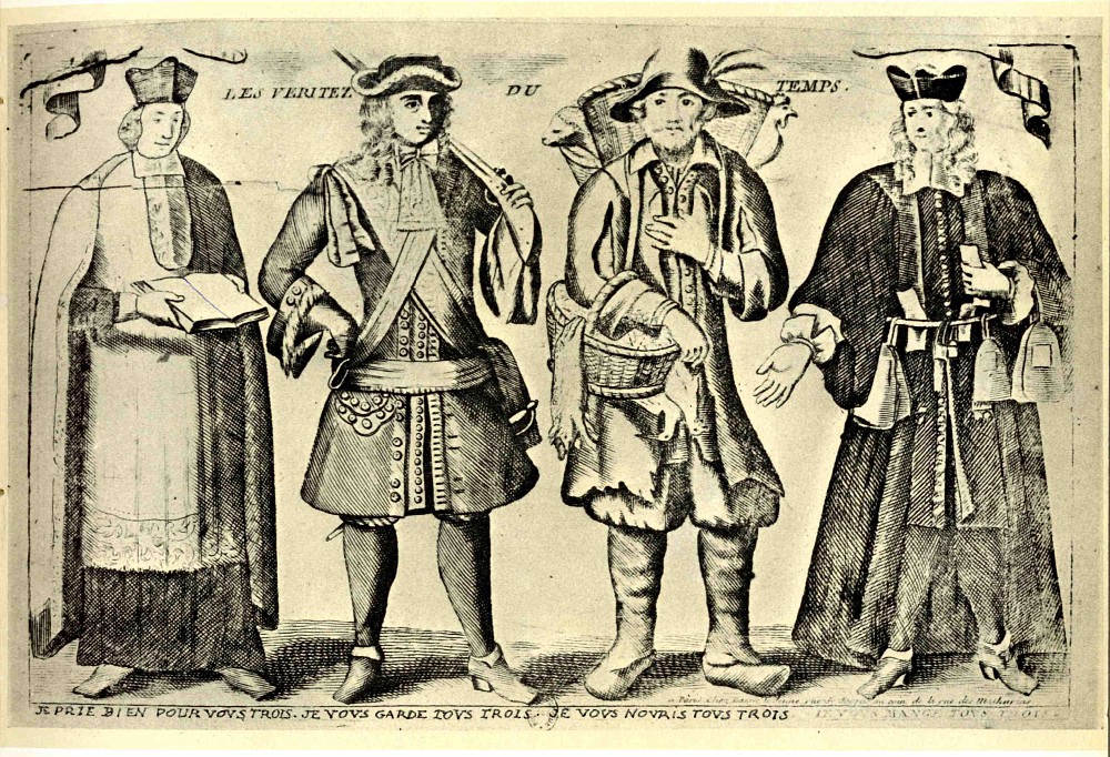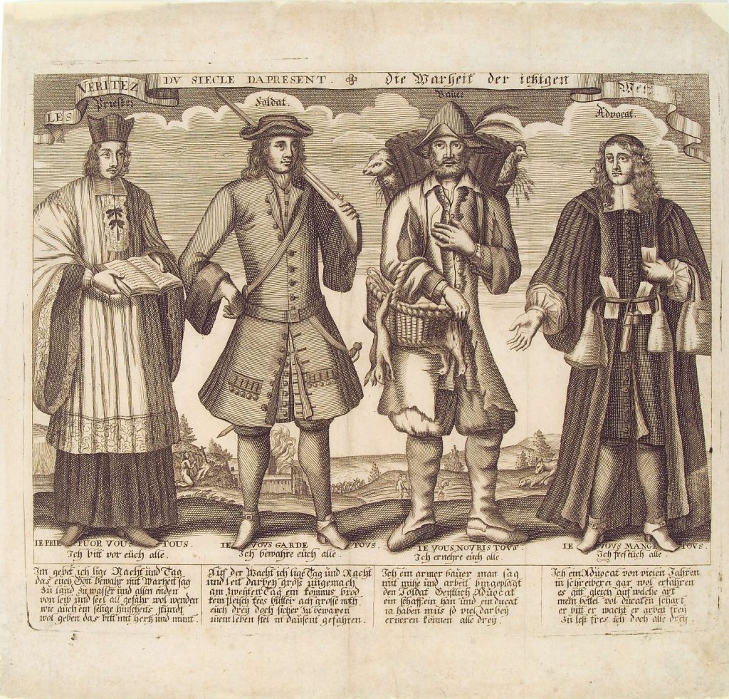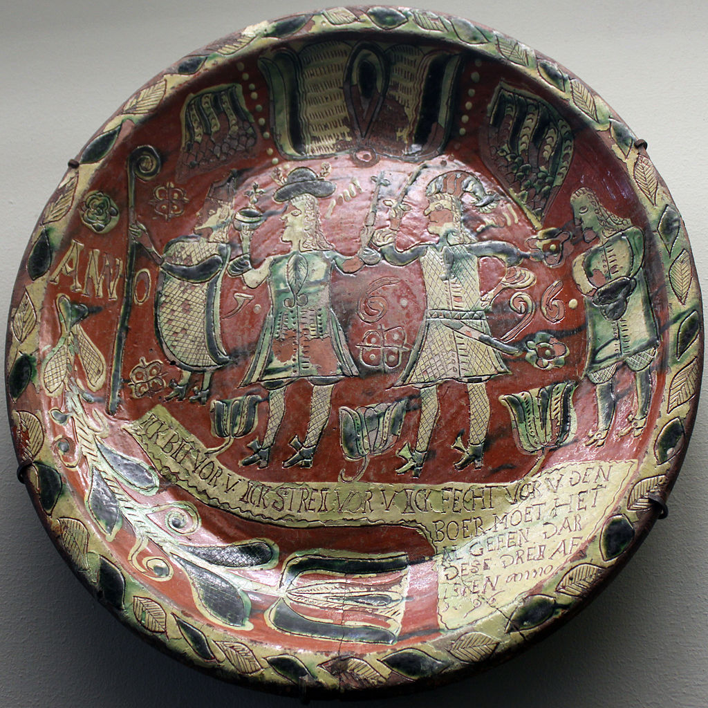 The Germanisches Nationalmuseum possesses an earthenware dish of decidedly popular appearance made in the pottery at Tönisberg, Kempen on the Dutch/German border and decorated in sgraffito technique. It is dated 1696 and depicts a Bishop, King, Soldier and finally the Peasant who supports them all: