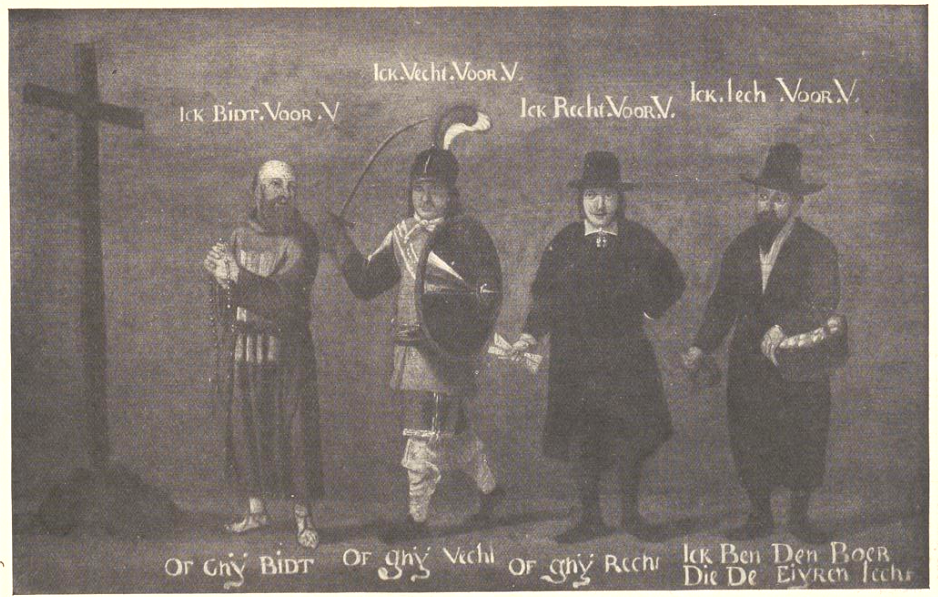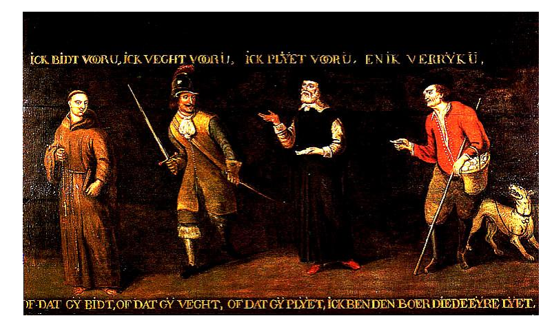 but the peasant, who is accompanied by a barking dog, also carries a basket of eggs, and his speech continues along the bottom of the panel: of dat gy bidt, of dat gy veght, of dat gy plyet, ick ben den boer die den eyre lyet [whether you pray, whether you fight, whether you plead, I am the farmer who ‘lays the eggs’, i.e. feeds you all]. A similar contemporary composition (below) was formerly exhibited in De Gulden Spoor, Antwerp, which housed the collection of Frans Claes.