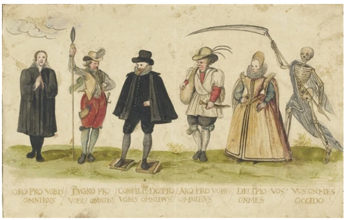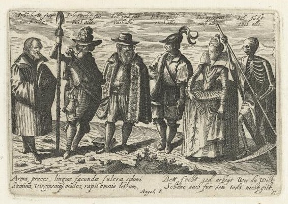 This is a motif which appears to me to evolve from an original model depicting the Three Estates, via the addition of Death (with — inevitably — incidental shades of the Danse Macabre). By the late 16C it is sometimes an incremental motif in which each ‘estate’ declares its service to ALL the preceding ones, but in which Death usually has ‘the last laugh’ — “and I kill you all!” Perhaps inevitably, from quite early in the history of this cumulative motif, Death’s role is sometimes usurped by the Lawyer — or the Woman (I deceive you all ).