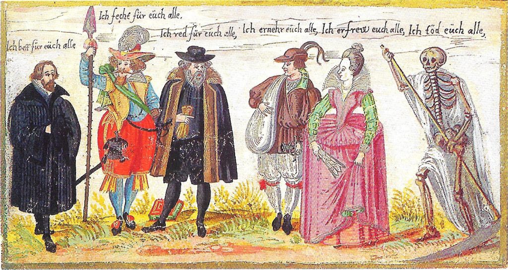 In an old picture, I found it thus written, The Pope with his Clergy, saies, I pray for you all; Cæsar with his Electors, I defend you all; The Clown [rustic, peasant] with his sack of Corne, I nourish you all: at last comes Death and sayes, I deuoure you all.