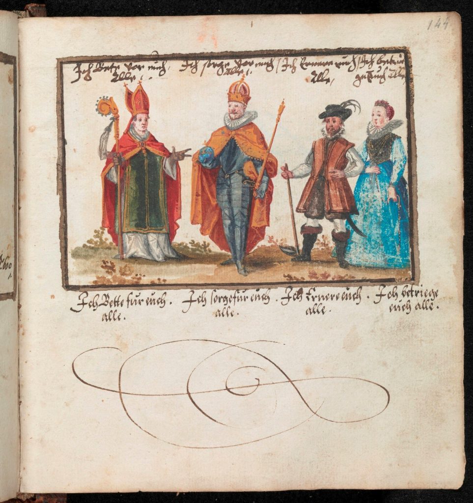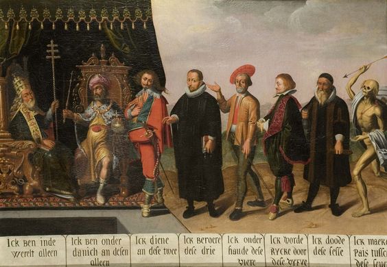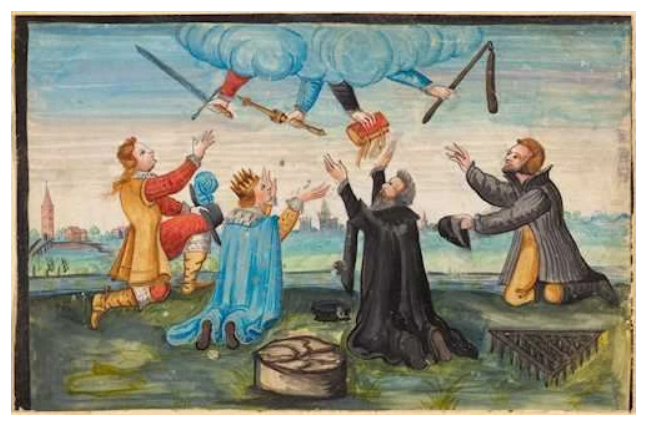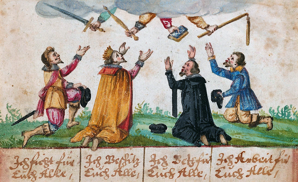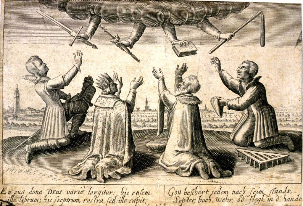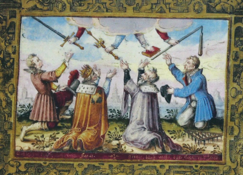 A somewhat different arrangement, featuring Four Estates, is painted into the album of Frans Rosenberg (1615×23). It shows a nobleman, a king, a clergyman, and a peasant reaching up to receive their attributes from four heavenly hands, respectively, sword, sceptre, book and flail.