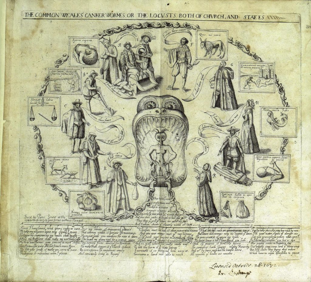 [essay available here https://www.academia.edu/42194242/_The_Common_Weales_Canker_Wormes_or_the_Locusts_Both_of_Church_and_States_Emblematic_Identities_in_a_Late_Jacobean_Print_ and Powerpoint presentation here: https://www.academia.edu/108369567/the_Common_Weales_Canker_Wormes_c_1625 ]