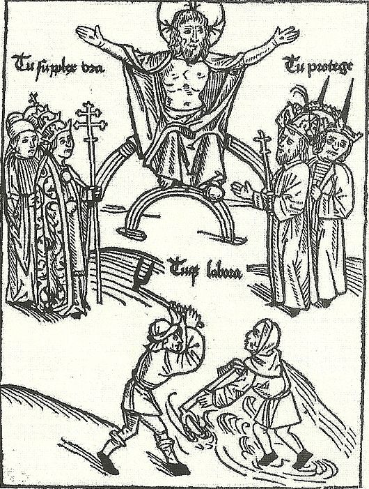 Particularly interesting is the above mid-15C fresco in the parish church of Wemding in Bavaria. Here each representative of the Three Estates is accompanied by an angel bearing a banderole with the appropriate verse (as in the album image above), but also by a devil bearing a banderole urging them, [Pope] sis infidelis [be unbelieving]; [Emperor] sis raptor [be rapacious]; and [Peasant ploughing] sis otiosus [be lazy].