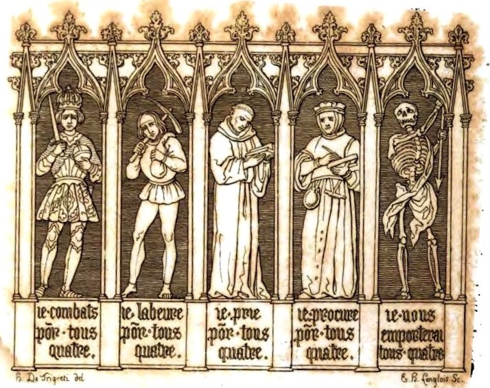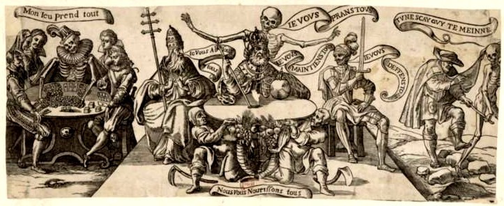 This print in the Hennin collection [BELOW] is composed of three scenes but only the central scene is of interest to us in the present context. The lefthand scene shows Death, the ‘winner who takes all’, and on the right, Death leading away a blind man (“you do not know who leads you”) copied from Holbein’s Danse Macabre series.* In our central scene we see the Pope (Ie Vous Absous tous) , the Emperor (IE VOVS MAINTIENS TOVS), and a noble Knight (IE VOVS DEFFENS TOVS), seated round a table literally supported by two Peasant labourers (Nous Vous Nourissons tous). Death — skeletal arms spread wide in triumph — proclaims IE VOVS PRANS TOVS.