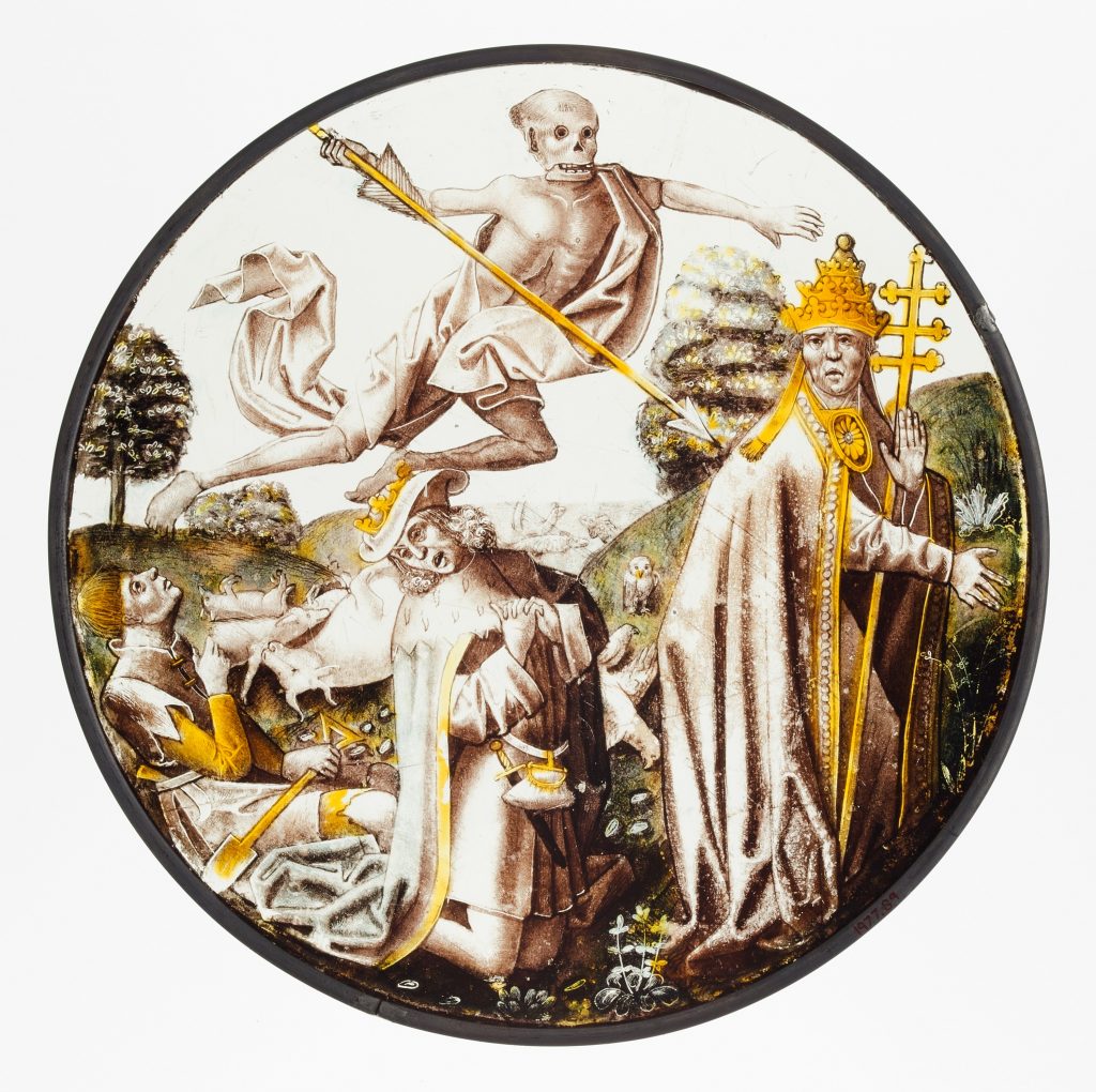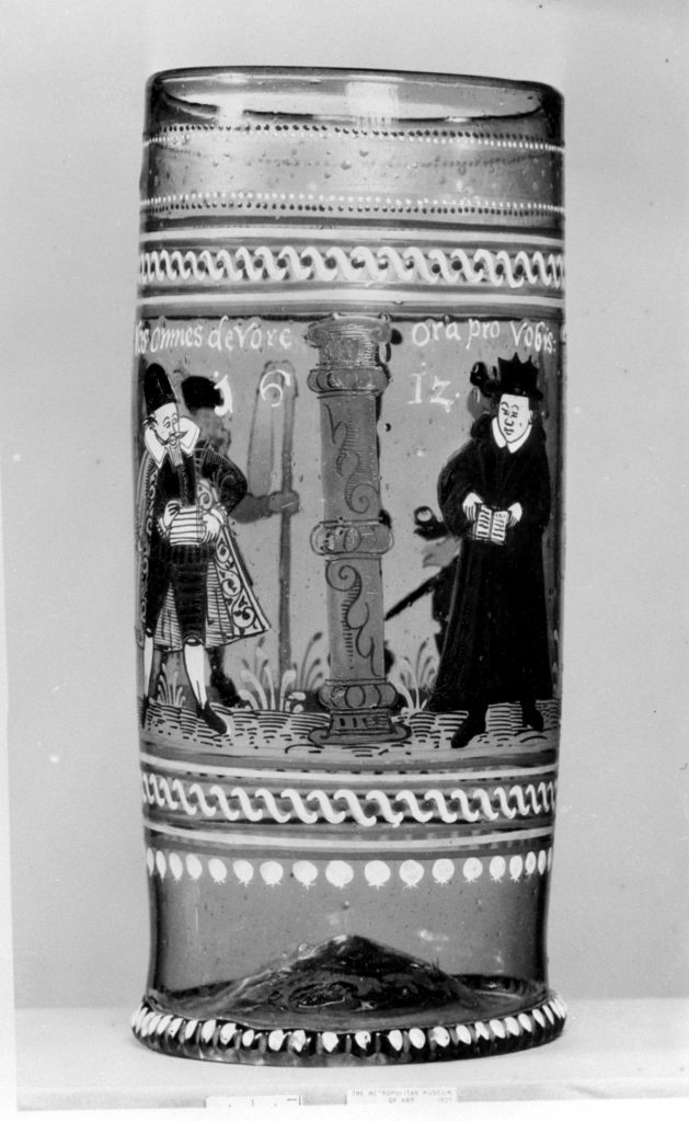 Beza gives no attributes to his characters, but it is interesting to see the Lawyer appropriate the role which is originally allotted to Death here – the lawyer having traditionally been seen, satirically, as similarly rapacious. The same personnel, with the Lawyer again usurping Death’s role (vos omnes devore [sic]), are to be found painted in enamel on this Bohemian Humpen dated 1612, now in the Metropolitan Museum, New York. Mistakenly described as a merchant on the Museum’s website, the pile of books he carries was intended to identify him as a lawyer.