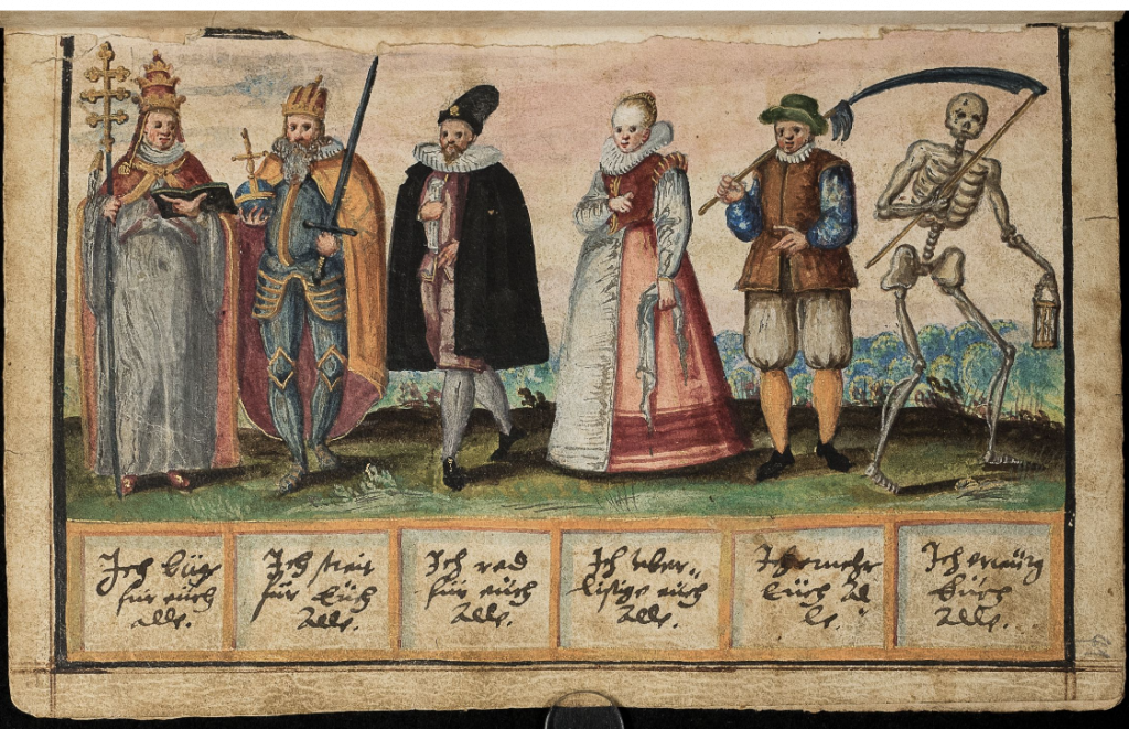 It is difficult to estimate just how old such an “old picture” might have been, of course, but from the context – the Electors being the Princes of Germany, formerly entitled to take part in the election of the Holy Roman Emperor (here Caesar, modern Kaiser) – we might guess that it must have belonged to the previous century, at least, and given the presence of the Pope, may even have predated the German Reformation. We might, then, be tempted to take this at face value, to accept that in Jacobean England, or while travelling in Germany perhaps, Basse had seen an early sixteenth- or late fifteenth-century German portrayal of the Three Estates (Pope, Emperor, Peasant) and Death. Sadly, the question-and-answer format, and the phrasing he uses, are suspiciously close to a passage in the 38th chapter — De Morte — of Leonardus Rubenus, Lingua aurea christianorum (Paderborn, 1606):