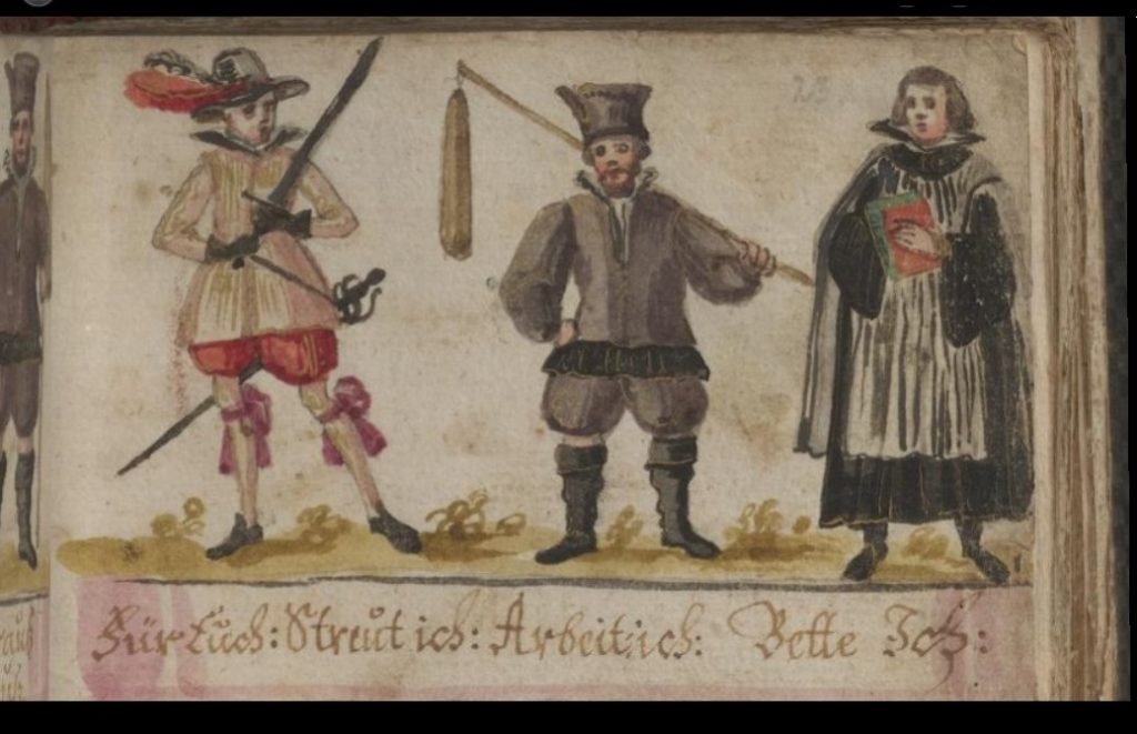 The Gertner album — dated entries 1619-33 — includes just 3 Alls; the caption begins, For you : then continues under the pictures of soldier, peasant and minister, respectively, I fight, I work, I pray — a Three Estates image without the presence of Death, and no-one devouring anyone!