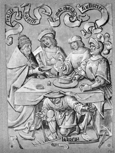 But to return to our proper theme … On the other side of the French drawing (ABOVE) the personnel are seated round a table; they are labelled from left to right, leglise, noblesse, merchandise and Austerite [firmness] personified, respectively, by the Pope, a nobleman, a merchant and a knight. Their tabletop rests quite literally on the back of a peasant who is labelled laboeur. This last detail seems to be a peculiarly French motif, found again later in the century on two prints, Hennin 1295, and a Rue de Montorgeuil woodcut which only survives in an English version (below). The drawings are currently misdescribed as deux caricatures antipapistes, as if Protestant satires, yet they are pre-Reformation in date, and while the Pope certainly appears, he is but one of the personnel belonging to this motif, and here as a representative of the Church (leglise), not Catholicism.