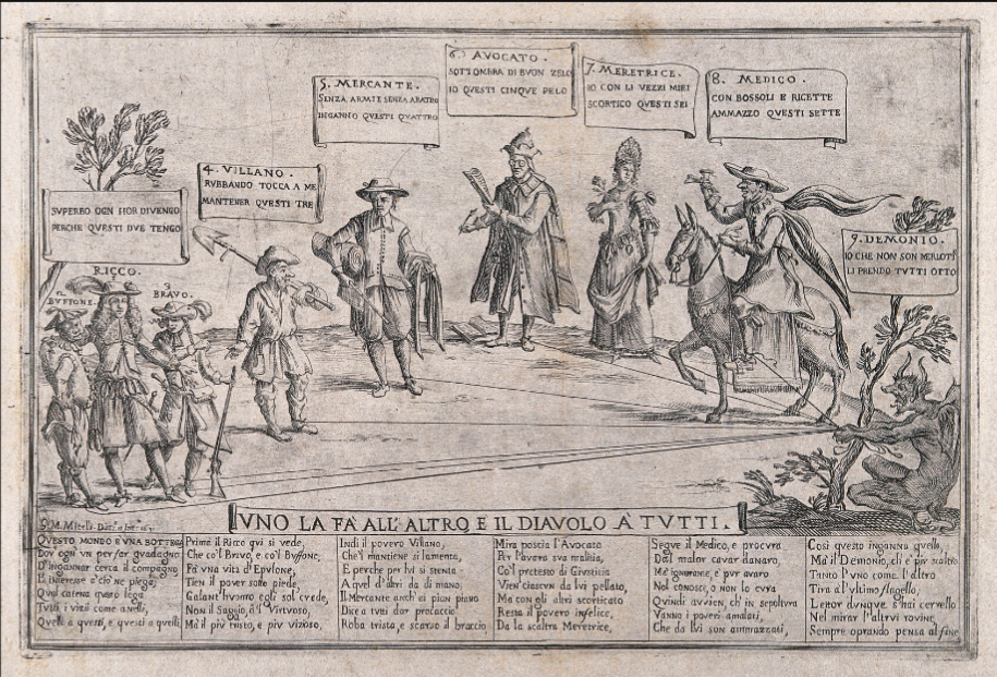 With its inset emblems, and disguised personnel (including the Gunpowder Plotters’ confessor, the Jesuit, Henry Garnet) all about to be drawn into the hell-mouth by a chain made of ears and tongues pulled by the Devil, it is a rather more sophisticated composition than the Italian print issued at the end of the century by Giuseppi Maria Mitelli, Vno la fa‘ all’ altro e il diavolo a‘ tvti [Each does it to the other and the Devil to all] (1691), but there is nevertheless a resemblance, especially in the first group of three figures, the Rich Man with his attendants