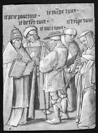 The earliest, but hitherto unnoticed, example of our motif, long before Beza’s description of 1587 – I would estimate the date at c.1510 – is a double-sided French drawing (plume, lavis de bistre et gouache). Here the personnel from left to right are Pope, nobleman, peasant, lawyer, and woman, saying respectively: