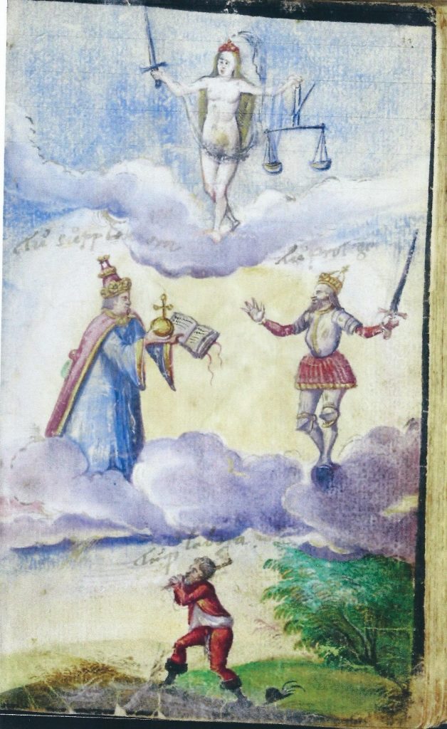 The album of Georg Bernhard (above) features a full page miniature painted c.1565 depicting, beneath a heavenly figure of Iustitia, a pope and a king (also in the clouds) above a decidedly earth-bound peasant hacking away at a log below. Justice’s instruction is written beside each figure, respectively: