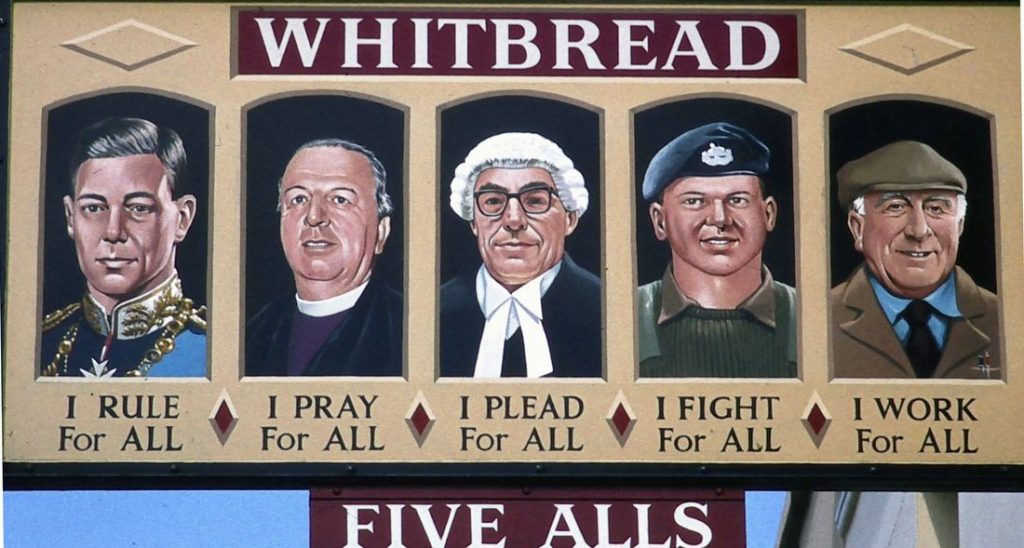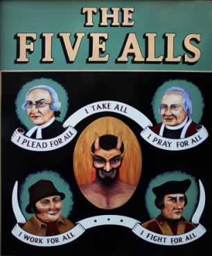 It was only to be expected that such a truly popular design would appear in the art of the street, as in the Haarlem house-sign above, and for England, Lillywhite recordsThe Five Alls as an inn-sign in 1660s London — a tradition which continues to the present day in numerous pub-signs