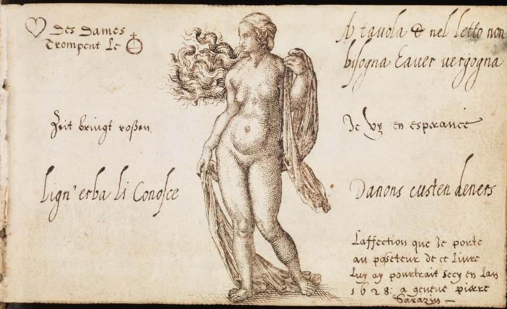 If the Devil’s role is here usurped by the Lawyer, it was inevitable that sooner or later — as in the album of Hans Ludwig Pfinzing von Henfenfeld (below) — the Devil would be ousted by the Woman (Ich betriege euch alle [I betray you all]). For a considerably earlier, French instance of the Woman in this role — SEE BELOW
