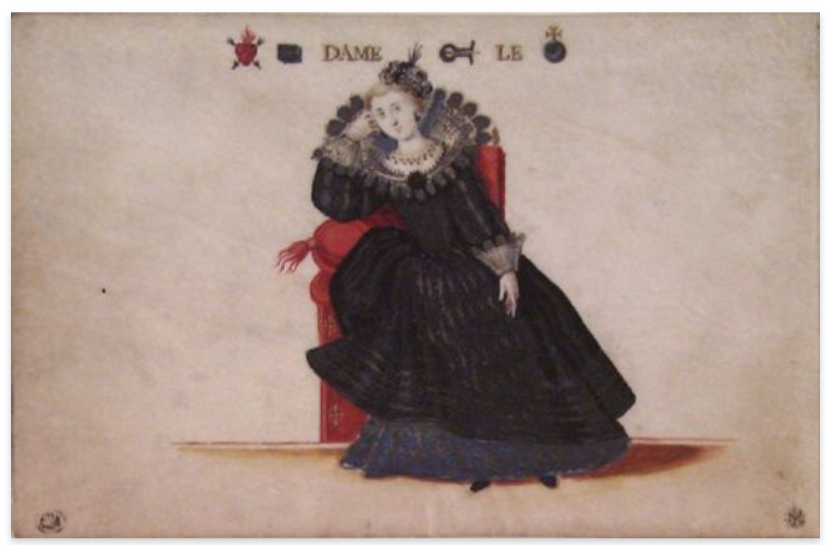 Extraordinarily, the woman in this French drawing is shown blowing a trumpet [trompe] – a rebus pun found elsewhere, and depending on the meaning of the verb tromper, ‘to deceive’, so that her speech, ie tro[m]pe tout, means both “I deceive all” and “I trumpet everything”! This rebus usage is found both before and after this date, and in three albums [SEE BELOW] where it occurs in the rebus sentence, coeur de dame trompe le monde [the heart of woman deceives the world] — though here the trompe is not a trumpet but a mouth-harp, also known as trompe in the French of this period.