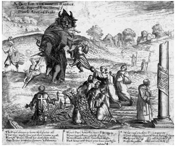 The 1621 sheet further gives its devil a Jesuit’s bonnet, and also includes similarly bonneted Jesuits amongst the men it is about to devour. The motif was eagerly seized upon in Jacobean England and features as the central scene in an English print issued three years later in Amsterdam by the Dutch artist and print-publisher, Claes Jansz.Visscher, surviving uniquely in the Bibliothèque Nationale in Paris. Entitled A Pass for the Romish Rabble, To the Pope of Rome through ye Diuels Arse of Peake (1624), it is a scatological broadside exulting in the (latest) banishment of Jesuits from England.