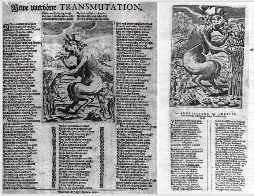 Postdating the album image, are another German broadsheet dated 1621 , entitled the Newe vnerhörte Transmutation [New unheard-of Transmutation], and a related but undated Dutch sheet, Den Ambassadeur Van Lucifer, Inde werelt gesonden tot een Krygs Transformatie),[iv] both clearly deriving their central priest-eating, mercenary-excreting, devil from the earlier German print.